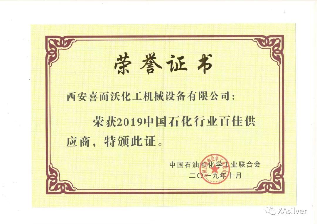 西安喜而沃榮獲“2019年度中國石化行業(yè)百佳供應商”